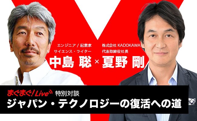 世界的エンジニアの中島聡さんと株式会社KADOKAWA代表取締役社長の夏野剛さんの対談が「まぐまぐ!LIVE」で配信されました。対談のテーマは「ジャパン・テクノロジーの復活への道」。今回のクロストークの模様を一部だけテキストにて特別公開いたします。(司会進行は/内田まさみ)。