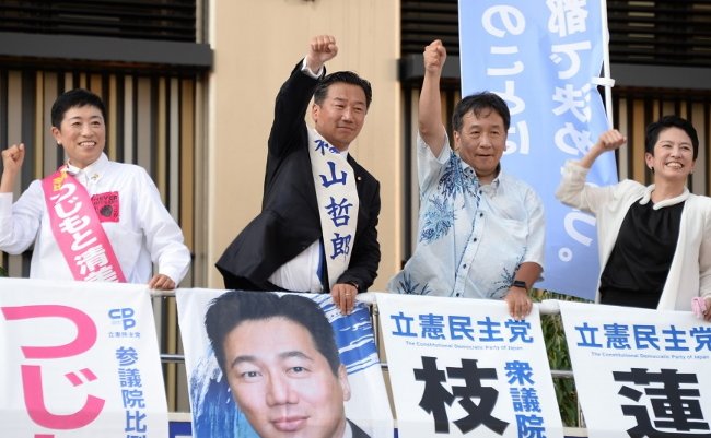 2日夕方、京都市下京区の京都タワー前。枝野氏は京都選挙区(改選数2)に立候補した盟友・福山哲郎前幹事長の応援演説に立った。街宣車には、先の衆院選で落選し、参院選で比例代表に立候補した辻元清美氏、東京選挙区(改選数6)で4選を目指す蓮舫氏の姿も。立憲のオールスターキャスト的なメンバーの集結に聴衆も盛り上がり、「京都大街宣」は一時ツイッターのトレンド入りを果たした。