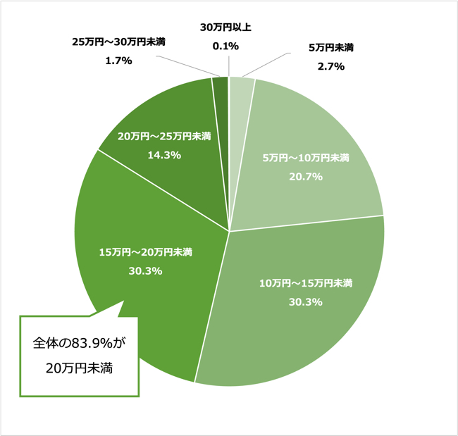 全体の年金月額は「10~15万円未満」と「15万円~20万円未満」の割合がそれぞれ30.3%と多数派となっています。全体の83.9%が20万円未満です。