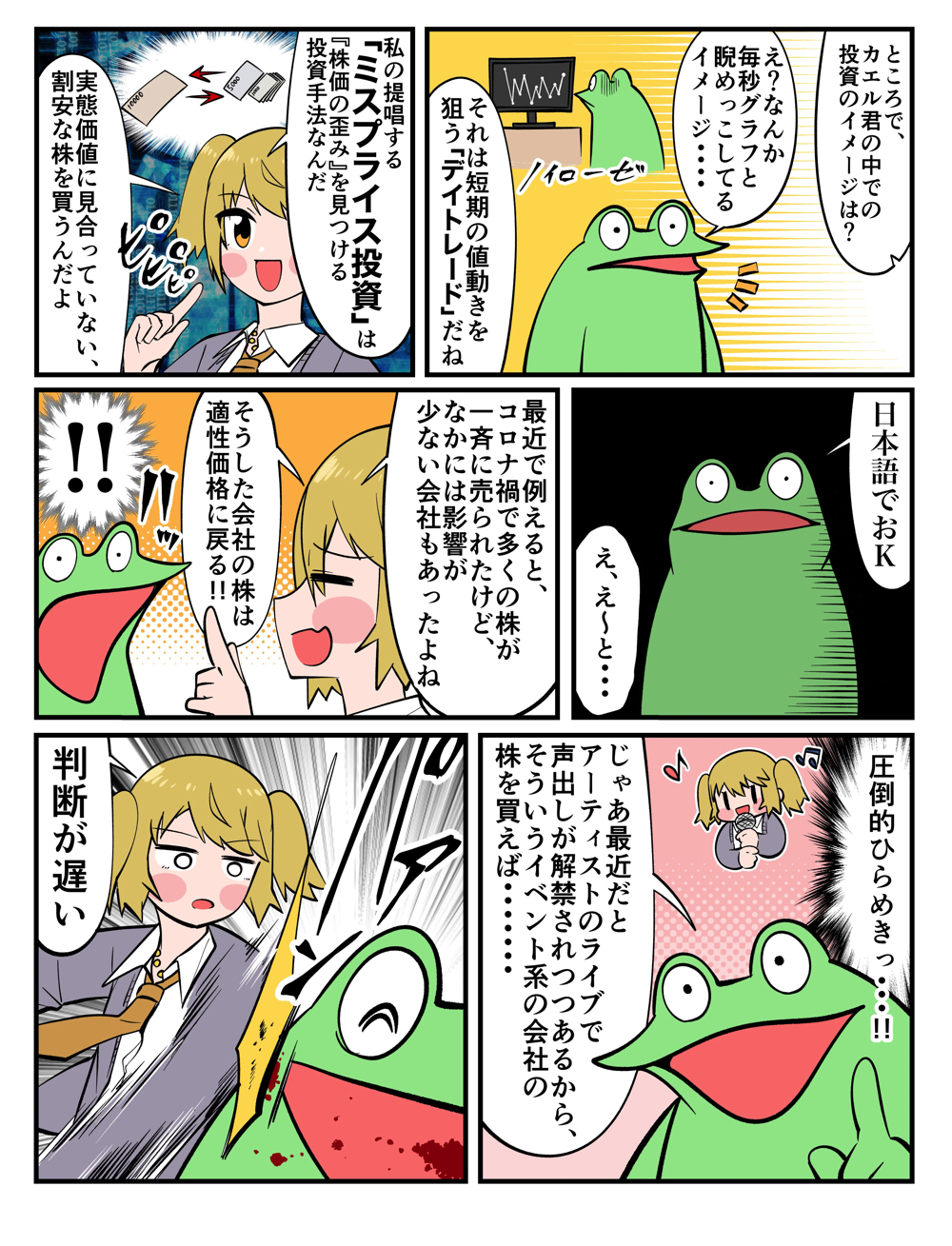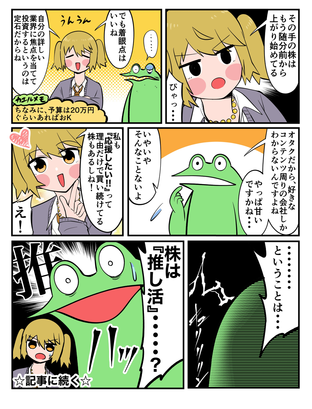 ていうか、株式投資って知識があるほど有利になるから、知らない業界より精通してる業界で戦った方が有利だよね。カエル君だったらアニメや漫画に関する会社の株をチェックすることから始めればいいんじゃないかな