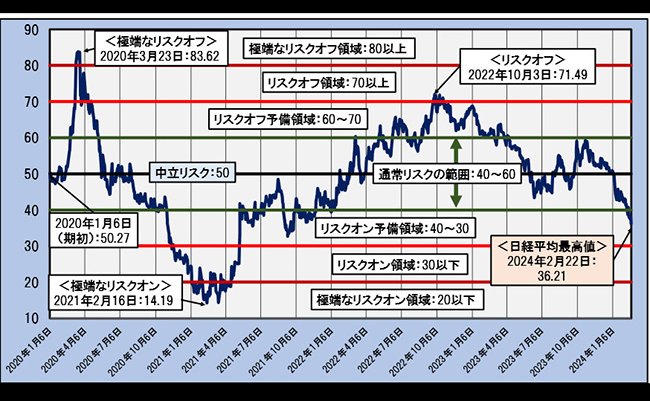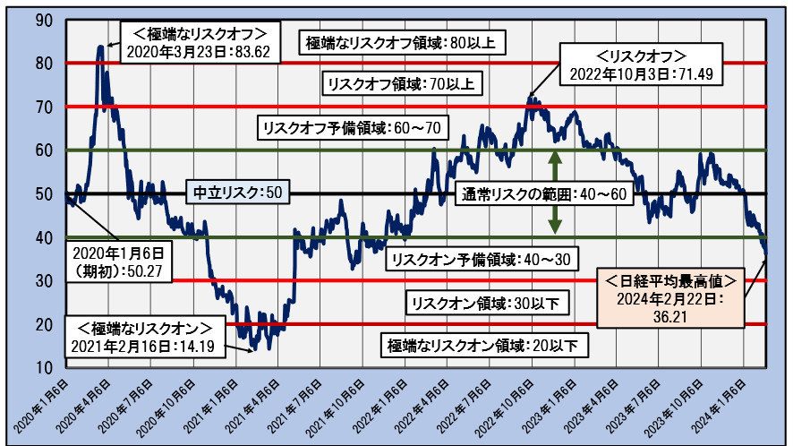 そして、2024年初から市場リスクは低下のペースを速め、相場も歩調を合わせて上昇、2月22日の日経平均史上最高値に達しました。この時点のリスク回避指数は36点台です。