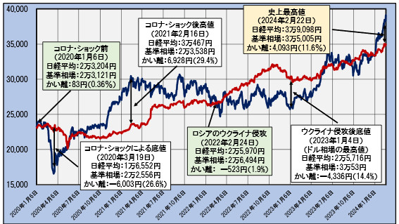 下の図は日経平均と、ファンダメンタルズに基づく日経平均の水準を示す「基準相場」について、コロナ・ショックを含む2020年初から日経平均史上最高値を更新した2024年2月22日まで日次ベースの推移と相場の節目における両者のかい離を併せて示したグラフです。