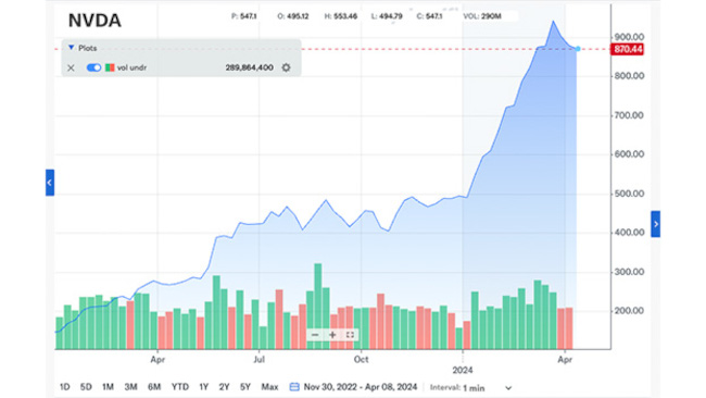 この期間のNvidiaの株をチャートにすると以下のようになります(Yahoo Financeを活用)。