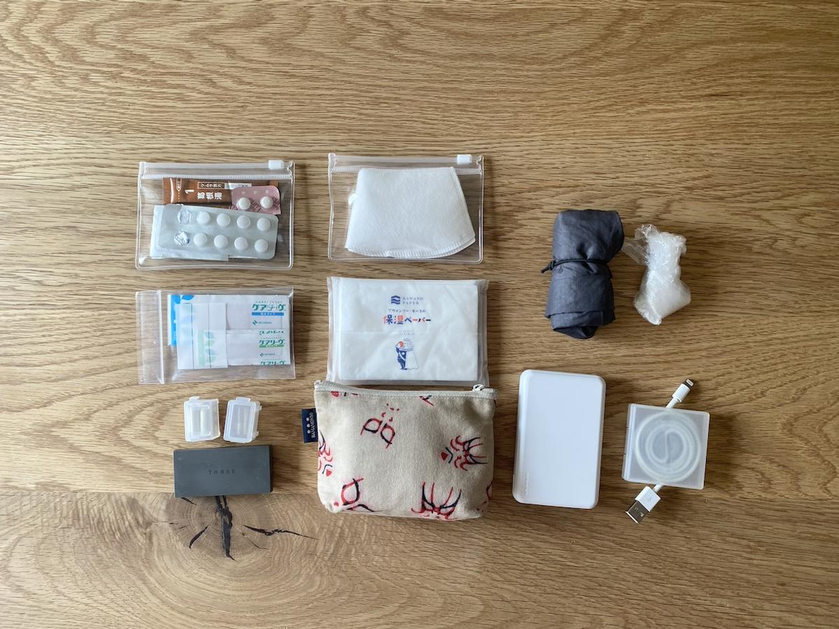 常備薬やサプリ、マスク、ティッシュ、メイクポーチ、追加のメイクアイテム、以前は別にしていた充電バッテリーもこちらに。さらに、エコバッグや以外と使うゴミ袋も。