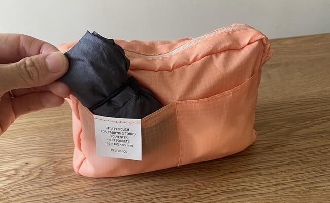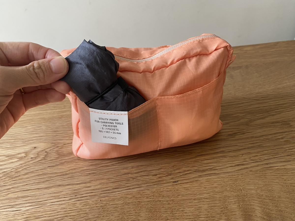 そして、メッシュの方にはメイクポーチをそのままイン。ちょっとだけ特殊な使い方かもしれません。