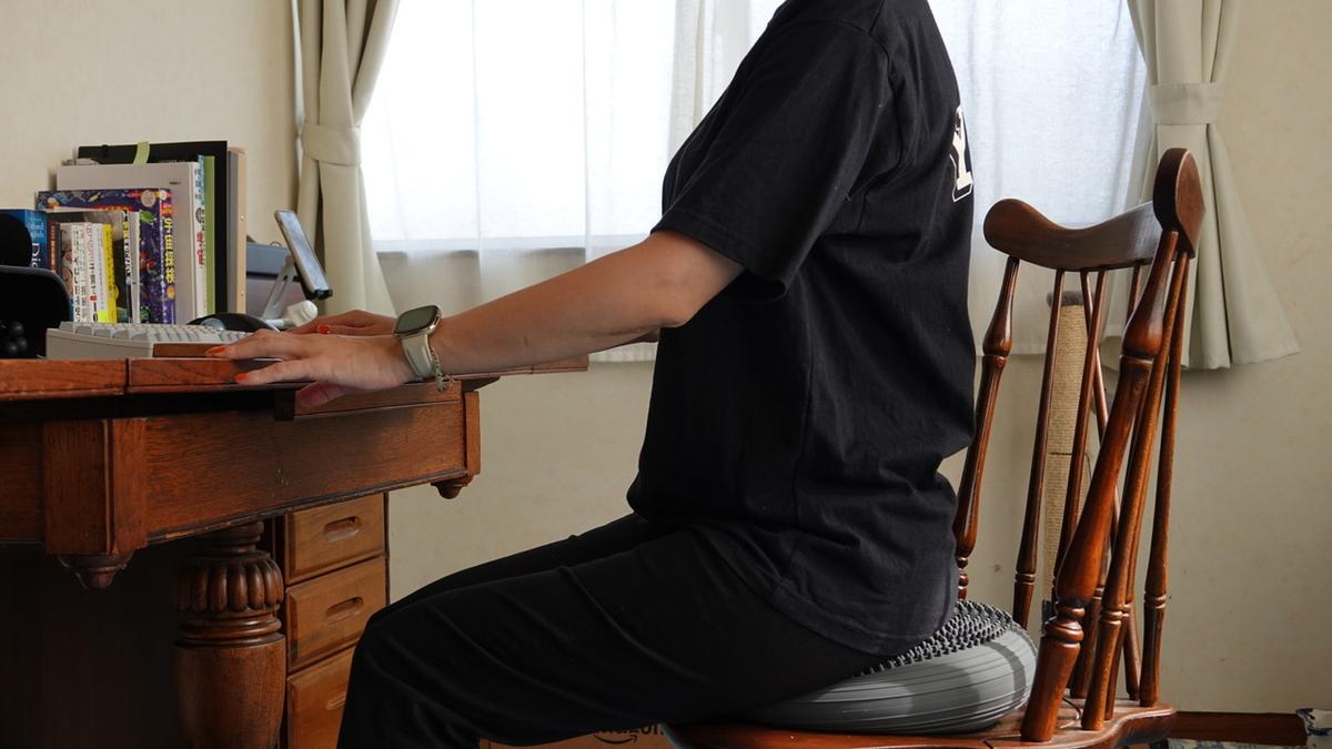 座るだけで姿勢が正す効果が期待でき、必然的にインナーマッスルが鍛えられるのだとか。数分なら大したことないのですが、10分もすると上半身がしんどくなってきました。これは効いているかも…!