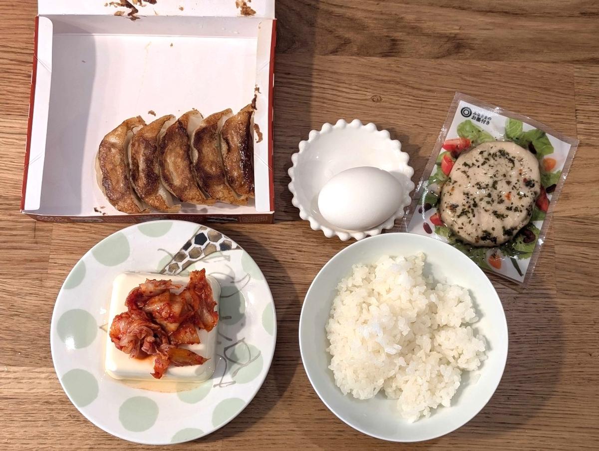 合わせとして、キムチを乗せた冷ややっこ、ゆで卵にサラダチキン。はい、私はタンパク質至上主義者です。