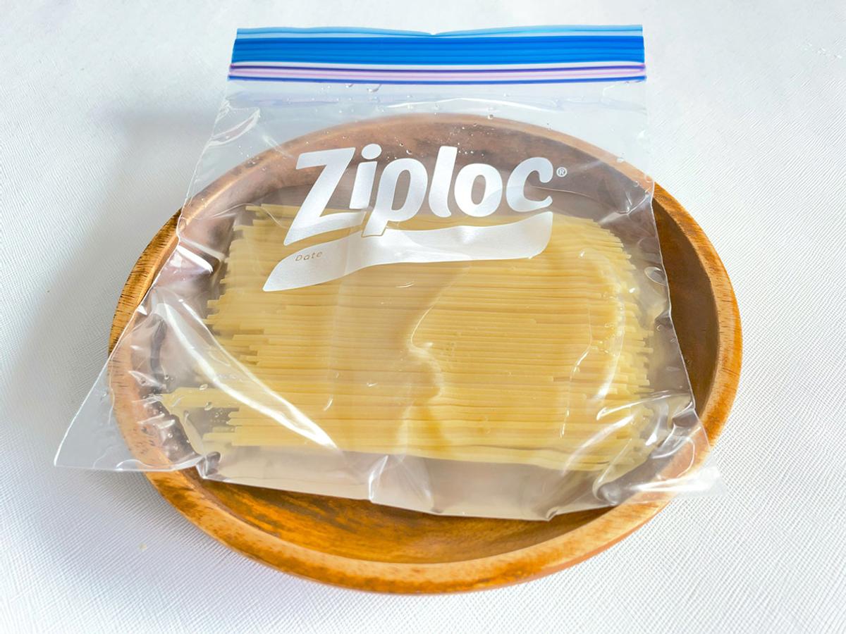 パスタを真ん中で半分に折り、ジップロック®にパスタと水約2〜300cc(パスタが全体的に水に浸かる量)を入れて2時間漬けます。