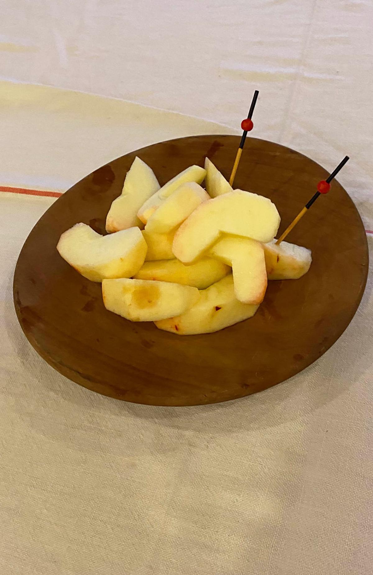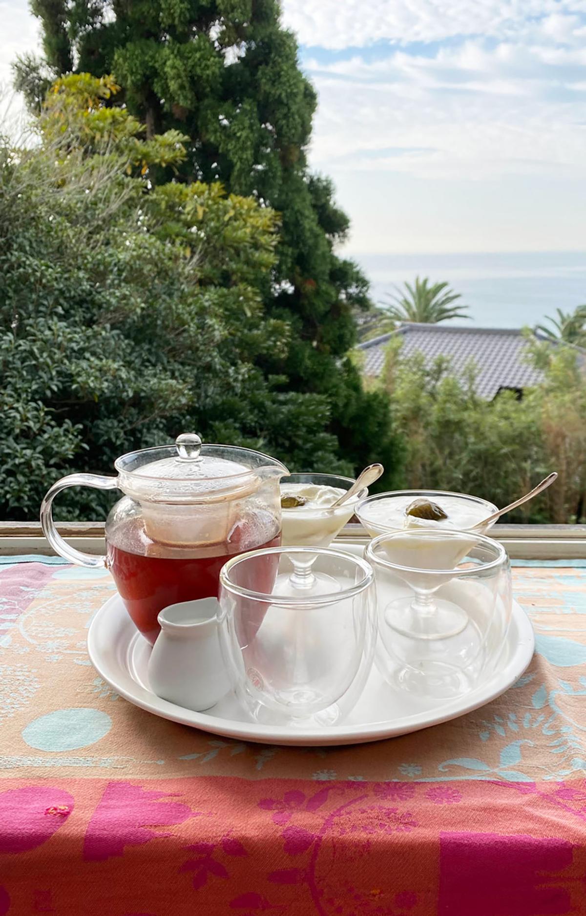 堀内家からの頂き物のうち、クロワッサン、パン・オ・ショコラ、フムス、パンナコッタ。どれもすごく美味しい! フランクフルトとcafé au laitは自前です。