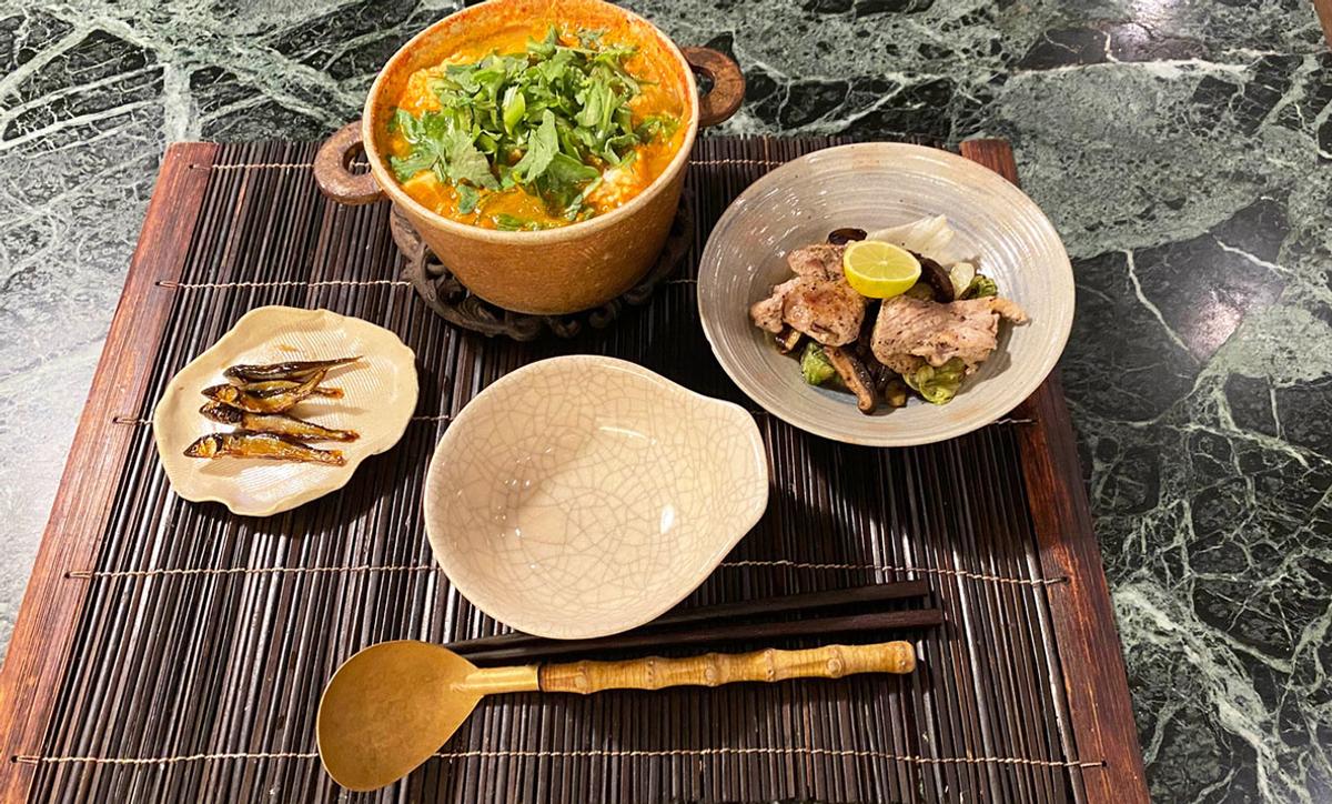 ひとりごはん。豆腐チゲもどきのチゲ、レタスとなすと豚肉炒め、琵琶湖で生まれた「若あゆ」と「本もろこ」、いただきました。甘じょっぱくて美味しい。懐かしい味わい。
