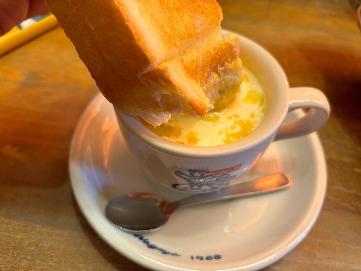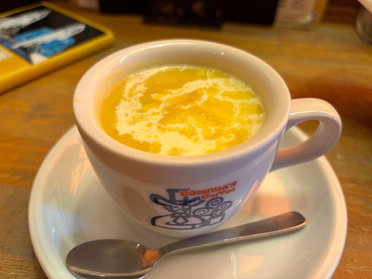 今日はコーンスープと、トースト+たまごサラダ+バターにしてみました。コーンスープもモーニングセットの対象なんですね。