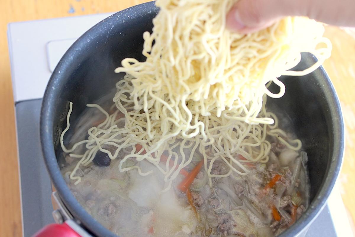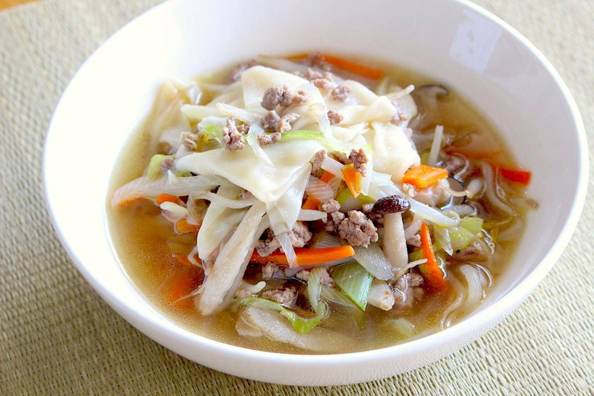 中華麺を入れて、「包まないワンタン麺」にアレンジしても美味しいですよ。つくるときは、中華麺の分量に合わせて水や調味料を足して味を整えてくださいね。