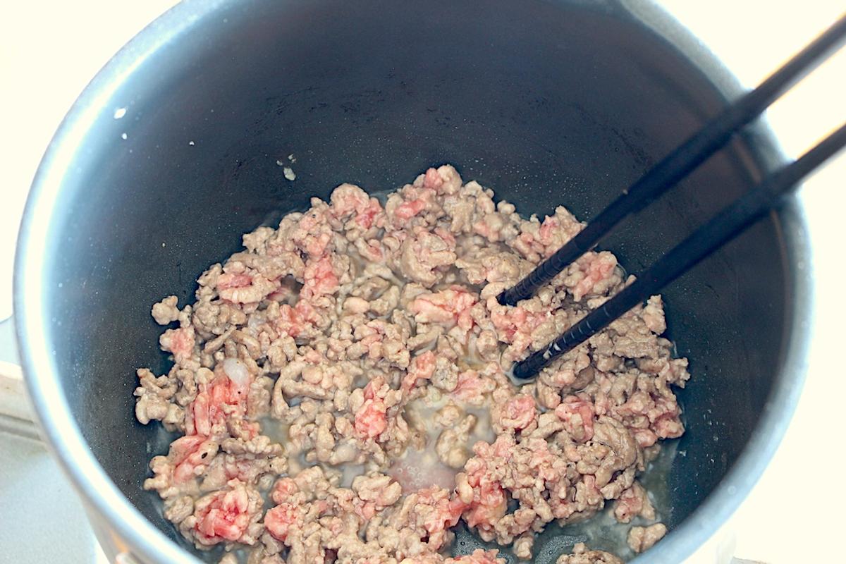 2. 鍋にごま油を引き、合びき肉を塩コショウ・おろしニンニクチューブ・おろし生姜チューブと共に炒める。