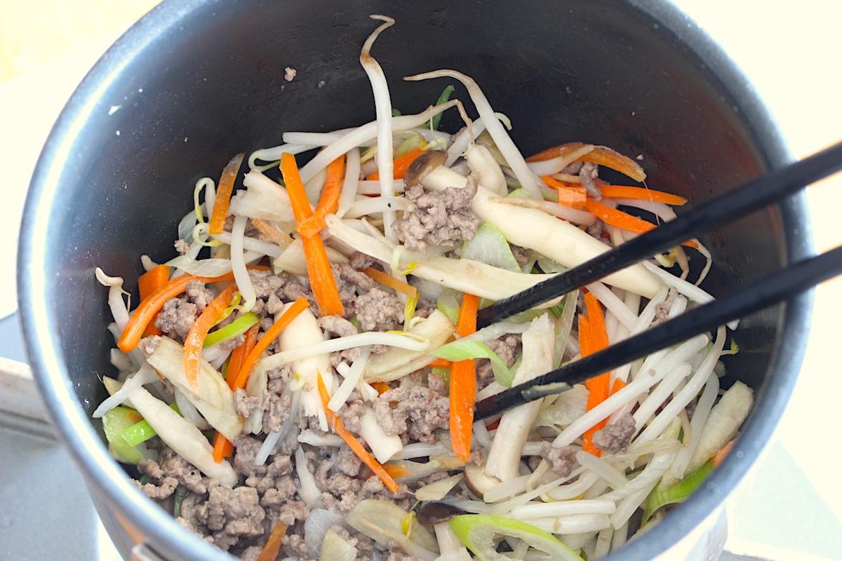 3. 長ネギ・ニンジン・ゴボウ・モヤシ・シメジを加えてザッと炒める。