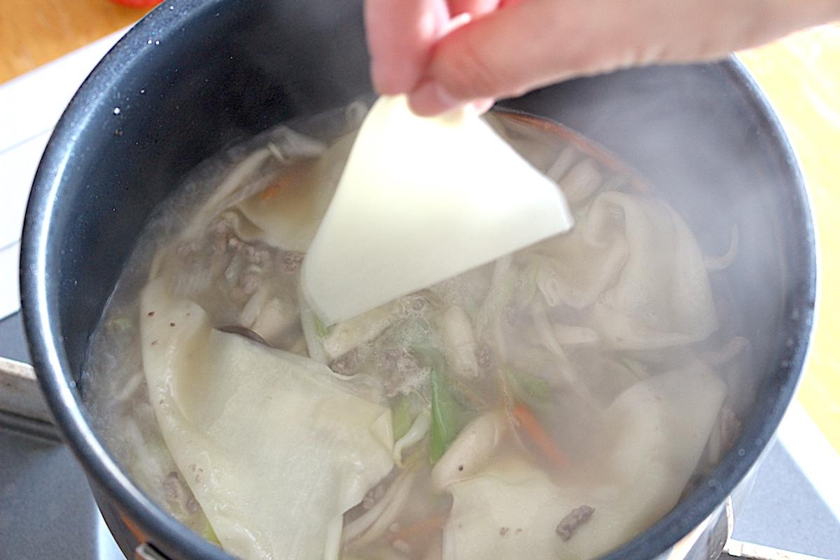 5. グツグツ沸騰してきたら、ワンタンの皮を入れて引き続き煮込む。※三角形に折って入れると、よりワンタンっぽく見えて◎。