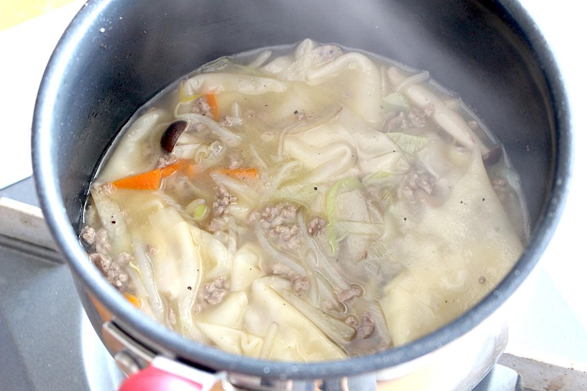 ワンタンの皮をそのまま入れるだけというお手軽スープ。でもご安心ください、口の中でちゃんとワンタンになるから!