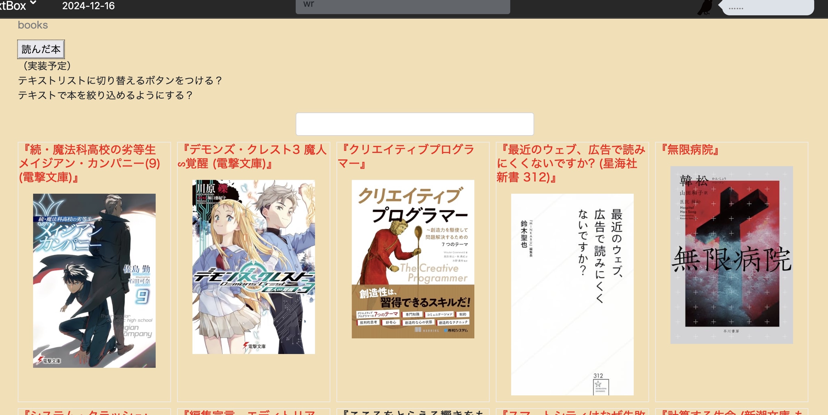 仕組みを説明するとそれだけで一コンテンツになるので割愛しますが、自分が買った本のデータがJSONにまとめられていて、そこにタグや読了日などの情報が入っており、それによってソート順を変えられるようになっています。