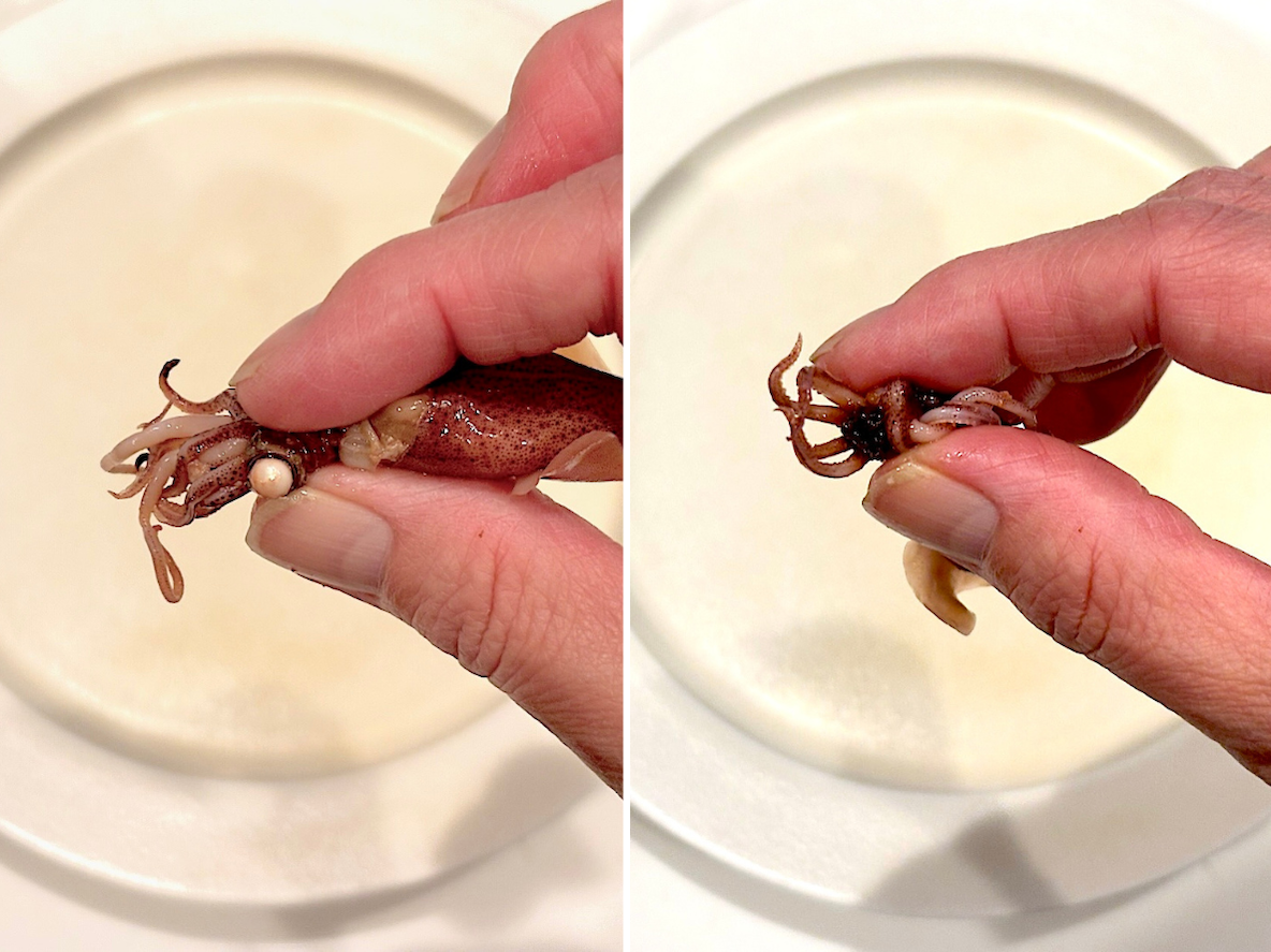 硬い目(写真左)と、足の付け根にある口(写真右)をつまんで取り除いておきましょう。このひと手間で口当たりが良くなり、より美味しく食べられます。