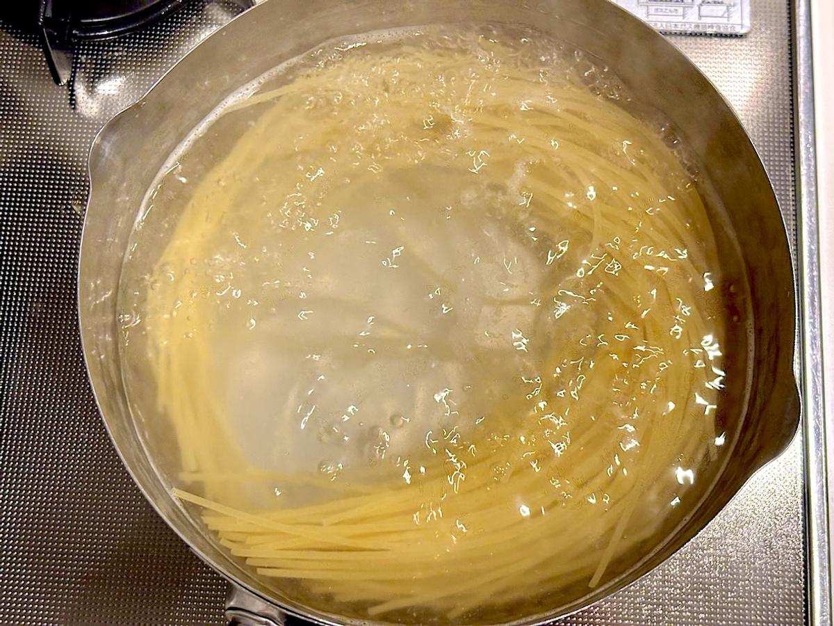 3. 2にゆであがったスパゲッティとかいわれを加える。全体をよく混ぜてソースを絡め、最後にオリーブオイルをひと回しする。