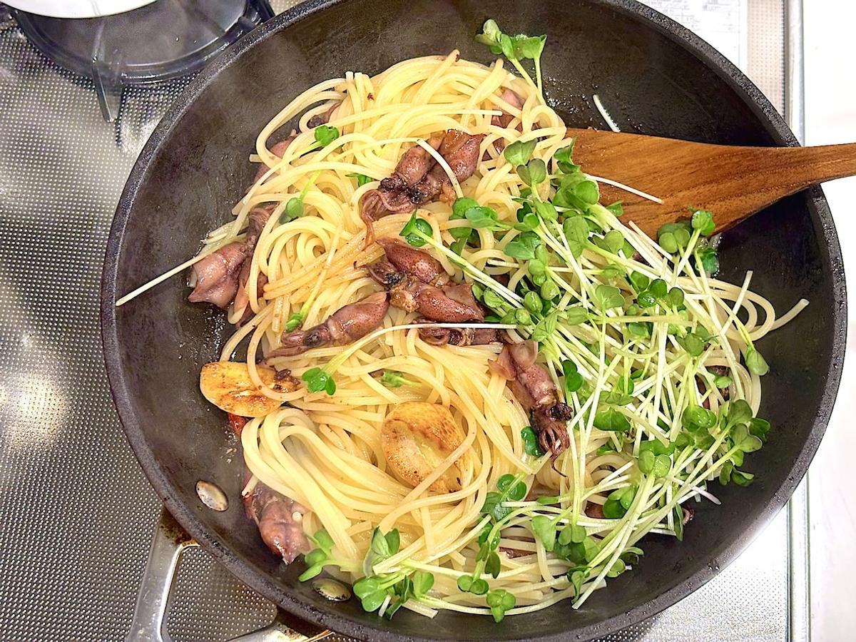 にんにくの香りを移したオリーブオイルで炒めるだけで「アーリオ・オーリオ」としては完成ですが、今回はパスタを和えました。