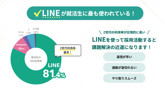 そこで、Z世代の利用率が圧倒的に高い「LINE」を使って採用活動すると、課題解決の近道になります。