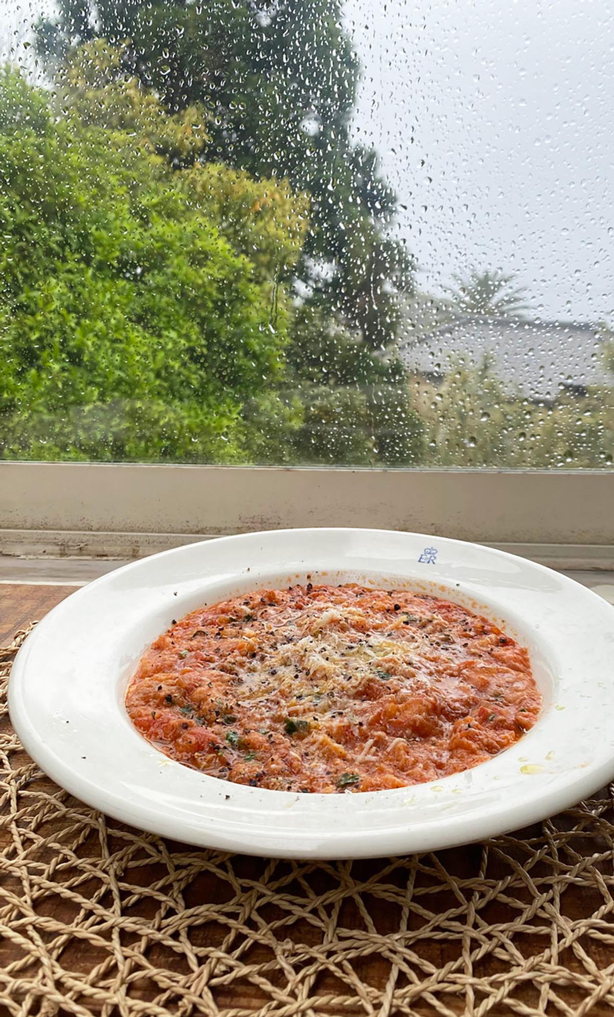 窓を打つ雨を眺めながらのランチは「トマトのパン粥」と