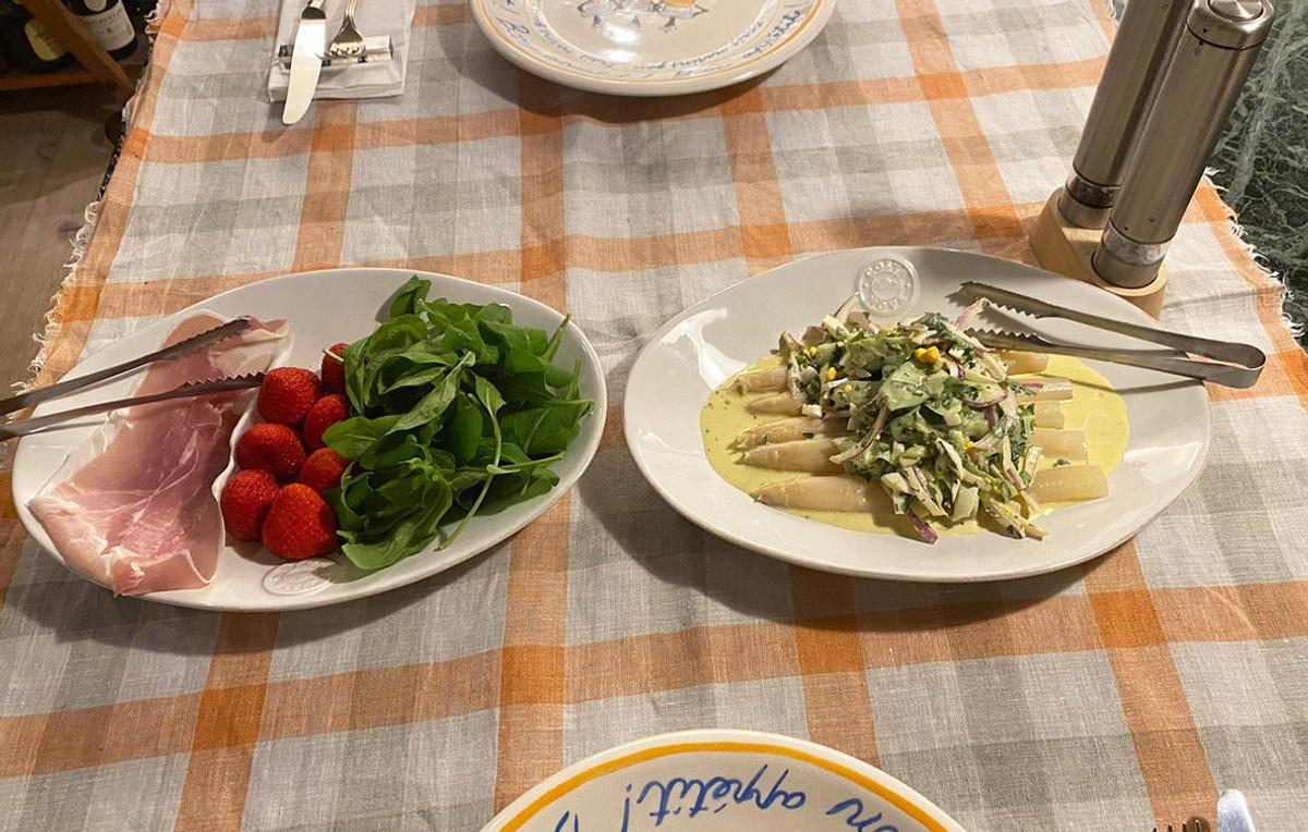 前菜2種。生ハムと苺とルコラ&ホワイトアスパラガス(瓶詰め)のミックス野菜載せ(イタリアンパセリ+ゆで卵+タマネギ+アーリーレッド+マヨネーズ)。