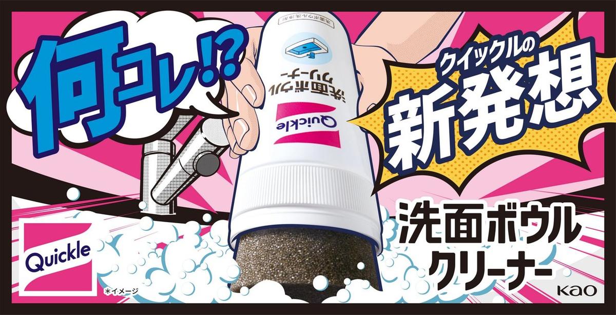 クイックルの「洗面ボウルクリーナー」は、洗剤とスポンジが一体化した形状が最大の特徴。ボトルを持ってなでるだけで、面倒な洗面ボウルの掃除がとても簡単になります。
