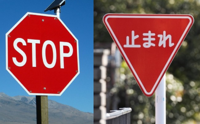 「止まれの標識が三角形(国際的には八角形が一般的)であることに加え、英語の“STOP”がないので、運転手は“止まれ”であると認識できない」
