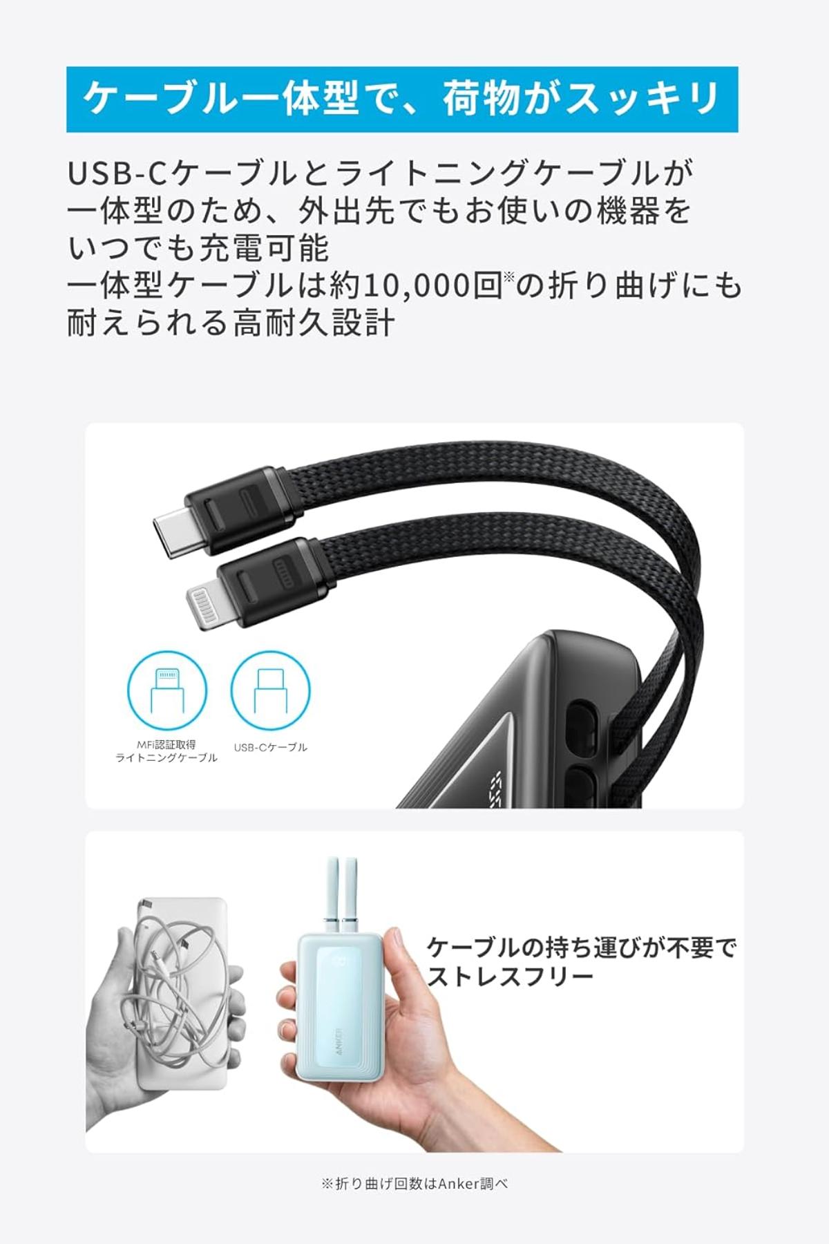 約10,000回の折り曲げに耐えられるUSB-Cケーブルとライトニングケーブル各1本が内蔵されているので、荷物が減る&ごちゃごちゃと絡まる面倒はなし。
