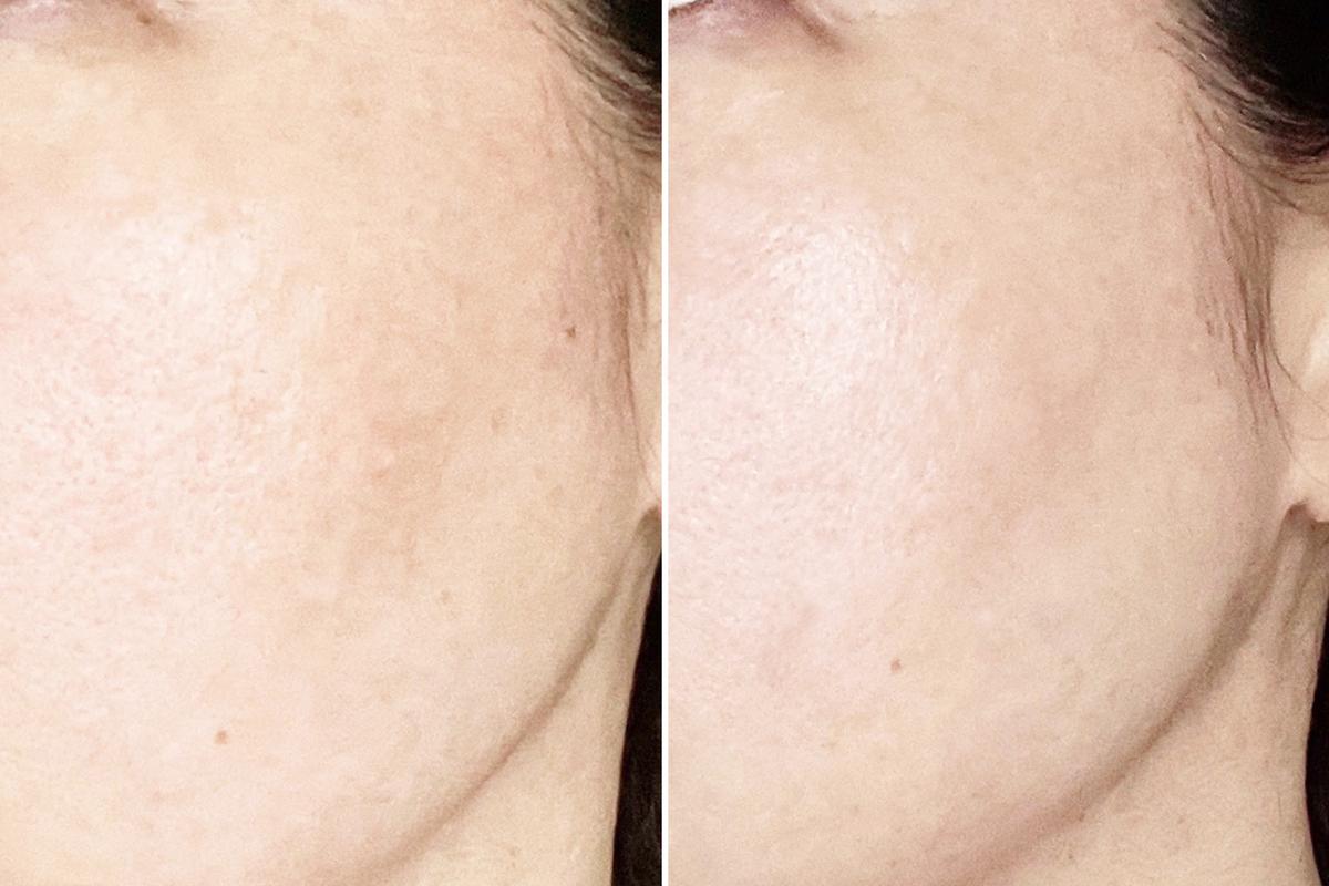 左・何もぬっていない肌。右・クロノビューティ ジェルUV EXを塗布。正直、筆者の毛穴肌を補正するほどの効果はないが、自然なツヤが出て健康的に見える