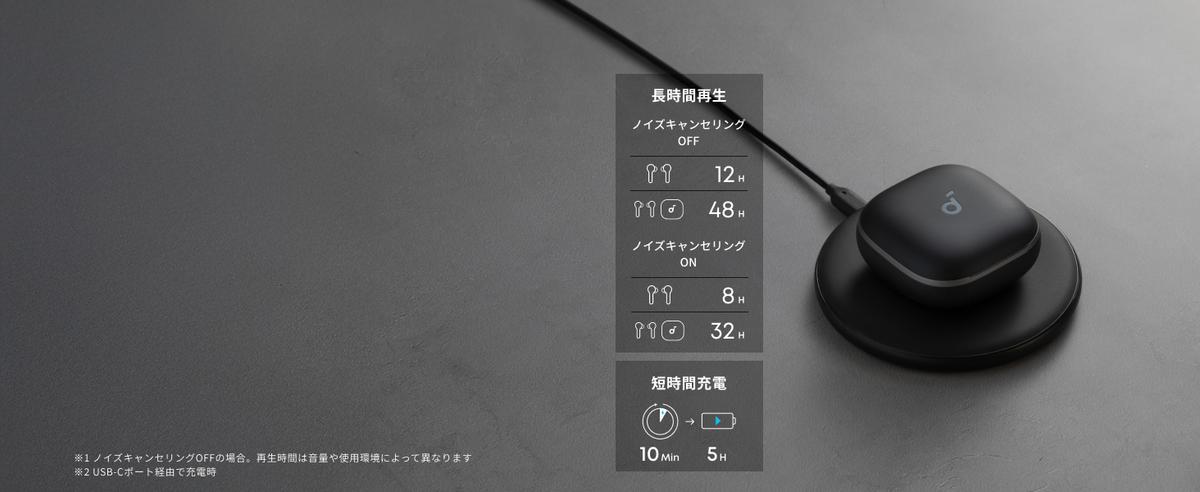 前モデルが最大28時間(充電ケース込み、ノイズキャンセリングOFF)だったのに比べ、なんと最大48時間再生にまで大幅アップしたんです! うっかり充電をしそびれても、まず問題ありません。