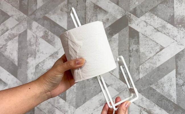 「フィルムフック トイレットペーパーホルダー」を使うと、トイレットペーパーを2つまで浮かせて収納することができます。