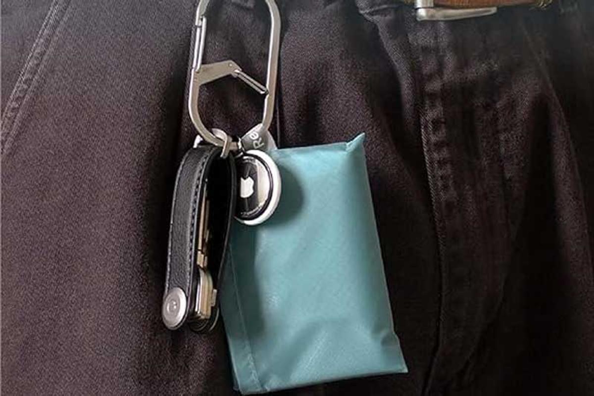 小さく畳めるからポケットに入れたり、カバンに忍ばせたり。タグにカラビナをつけてカスタマイズするのもよさそう。