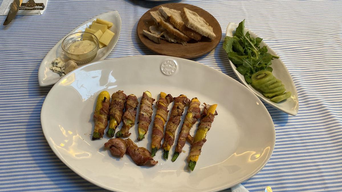 ズッキーニの豚肉巻き(焼き)、ルコラ、キウイ、タバティエール(パン)、チーズ(Epoisse,Comte,Roquefor)。