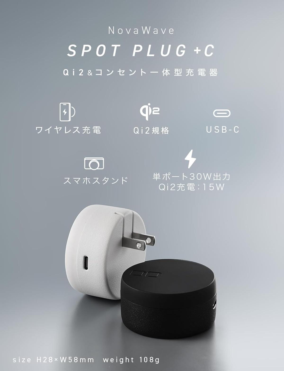 「NovaWave SPOT PLUG +C」は、マグネット吸着式ワイヤレス充電規格「Qi2」規格認証のチップを採用したワイヤレス充電器。なんと、 コンセントプラグを一体化することでケーブルを一切使う必要がなく、「完全ケーブルレス」充電が可能なんです!