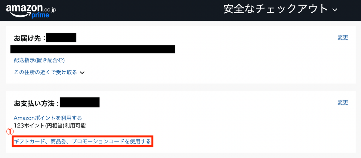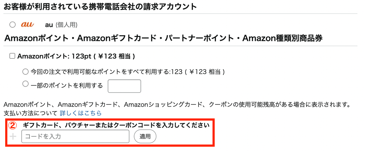 商品をカートに入れて、決済画面に進みます。お支払い方法選択の箇所にある、上記画像①の「ギフトカード、商品券、プロモーションコードを使用する」をクリック。