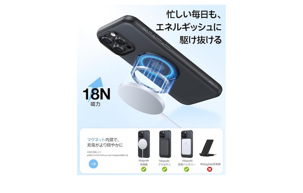 MagSafe充電器やマグネット付き車載ホルダーに対応した強力なマグネットがケース背面にあり、激しい揺れでも簡単には外れません。