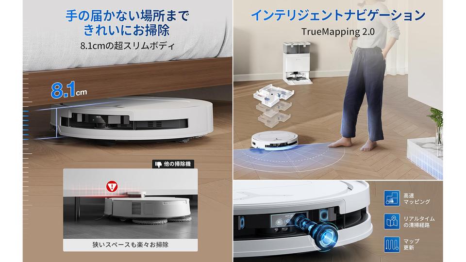 クリーニング性能については、15,000Paの強力な吸引力とデュアル回転式モップのOZMO Turbo 2.0モッピングシステムが、細かなホコリ、ペットの毛、頑固な汚れまで、あらゆる汚れを一掃。人の手をほとんど必要とせず、徹底的にキレイにします。