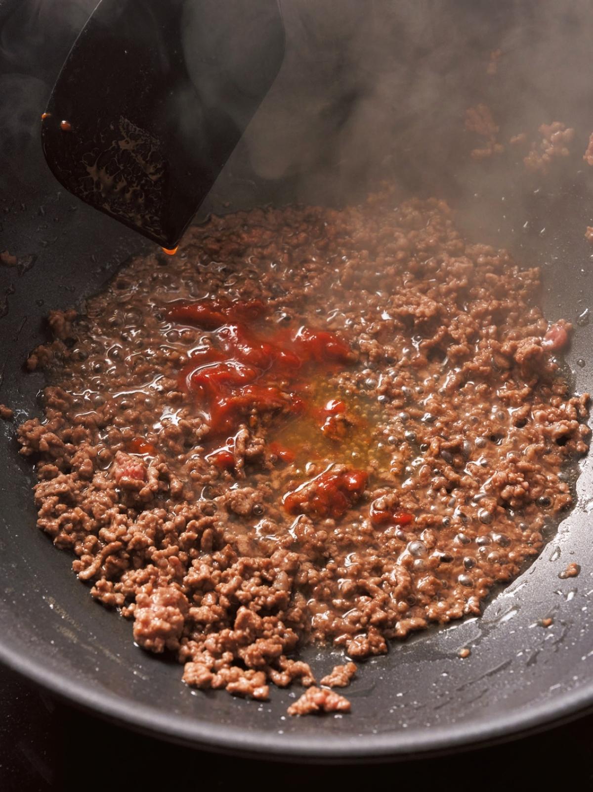 ※肉から出た脂で豆板醤をしっかり炒め、香りを出しましょう。