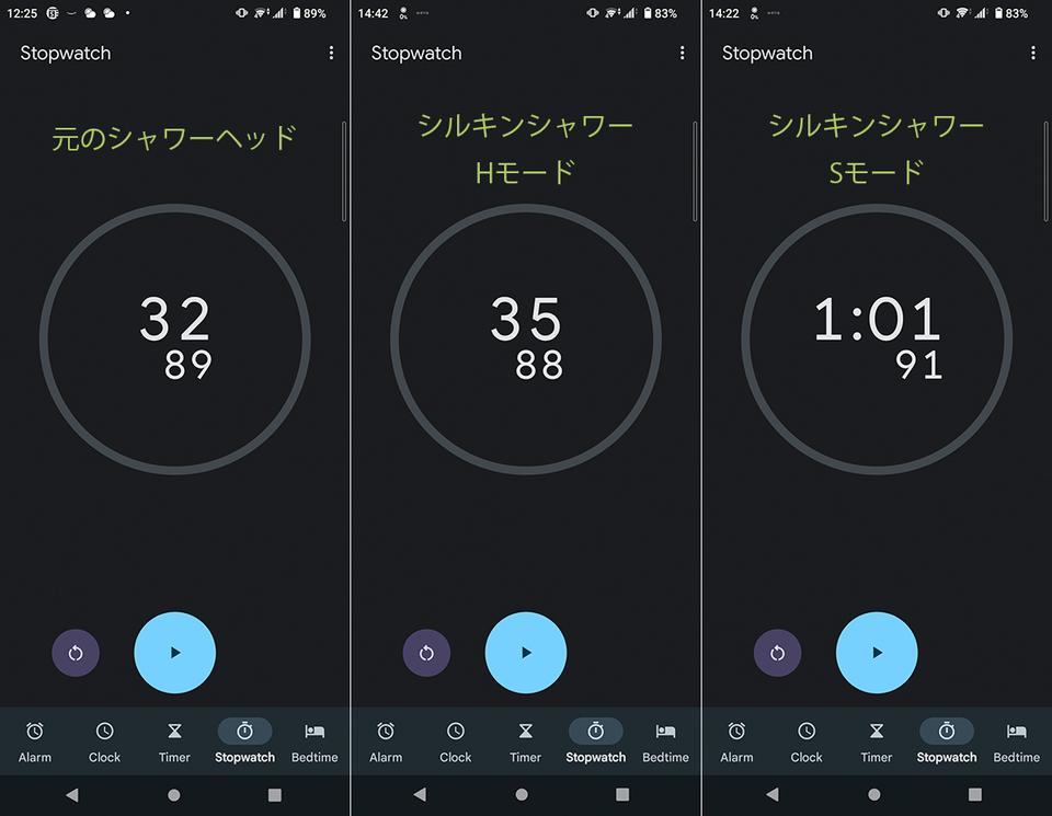 左から、従来品、「シルキンシャワー プレミアムステンレス」のHモード(ハードモード)、Sモード(ソフトモード)です。