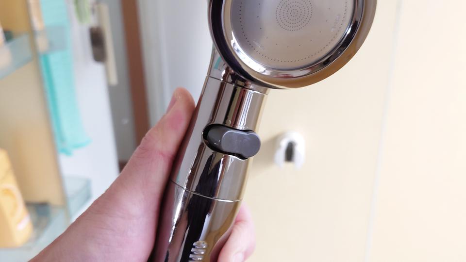 「シルキンシャワー プレミアムステンレス」の特長はもうひとつ。使い勝手がいい手元ストップボタンも見逃せないところ。