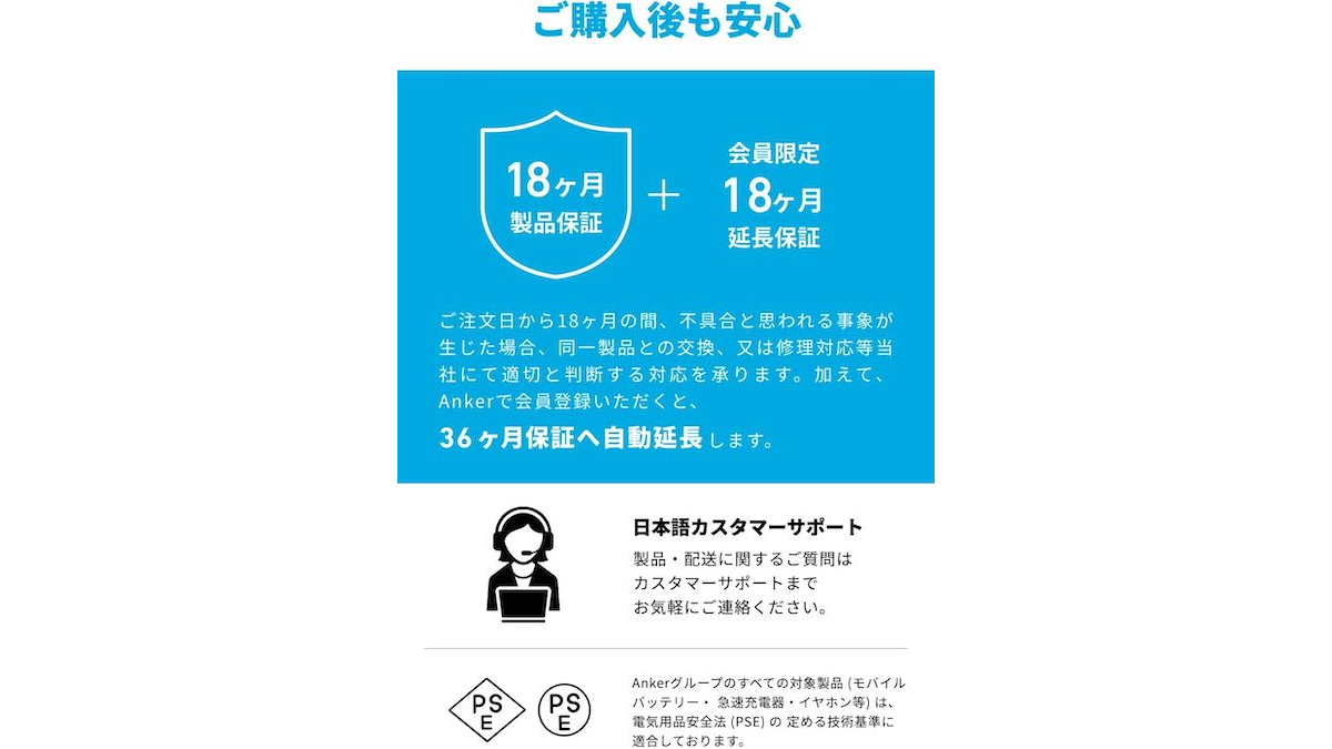 メーカー保証は18カ月ですが、Anker会員登録で保証期間が3年間に伸びるのも有難いですね。