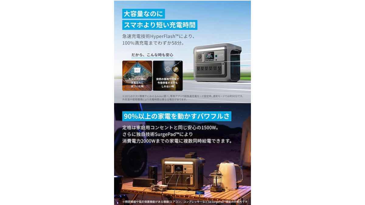 定格は家庭用コンセントと同じ1500Wで90%以上の家電に対応しており、1度に複数の機器を充電できるので停電時でも安心です。バッテリー容量は1056Whと大容量なのに、コンセントでの充電なら約58分で、スマホよりも早くフル充電できるスピードは優秀。