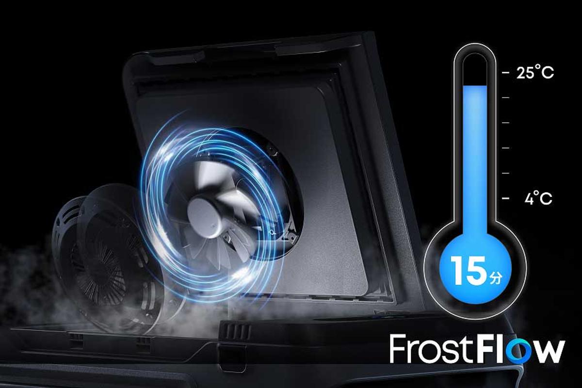 サイズは約74.9cm(幅)x 45.9cm(奥行き)x49.3cm(高さ)で、ハンドルを持って移動もできる大きさ。本体天板にあるファンと独自技術のFrostFlowによって、庫内をムラなく短時間で冷却。