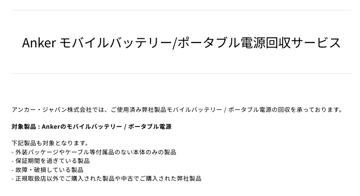 Ankerのモバイルバッテリーであれば故障・破損していてもOKとのこと。さらに正規取扱店以外で購入したものも回収してもらえるとも書いてありますね。すごい!