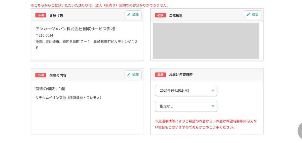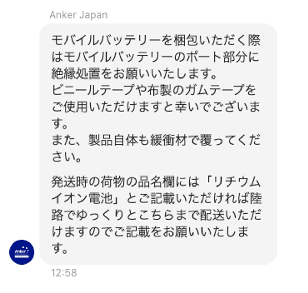荷物の品名には「リチウムイオン電池」と記載する必要があるので、そこも忘れずに。