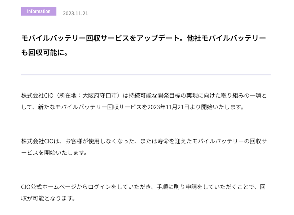 Ankerの回収サービスは「Ankerのモバイルバッテリー」に限るものでしたが、CIOの回収サービスは「他社製品もOK」とのこと。こちらも、破損・変形していても大丈夫だそうです。