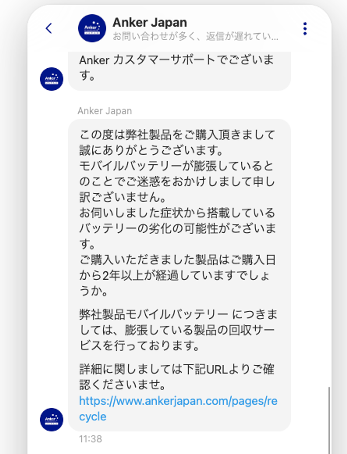 返信をいただくまで1時間ほどかかりましたが、「膨張している製品の回収サービスを行なっております」とのお返事をいただけてひと安心。