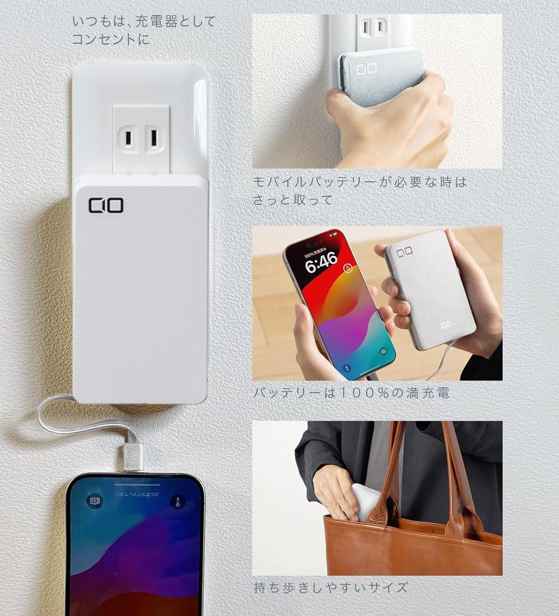 プラグが内蔵されていることで、通常のUSB充電器のようにコンセントに接続して使用でき、もしもの時はモバイルバッテリーとしても使えるという、安心感のカタマリというわけ。